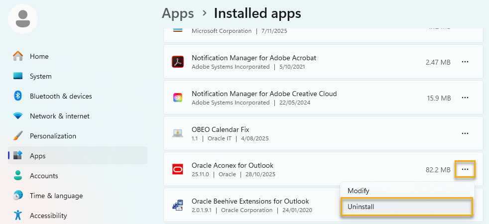 These instructions explain how to uninstall Oracle Aconex for Outlook on Windows 11. If you are using a different operating system, please contact your IT department.