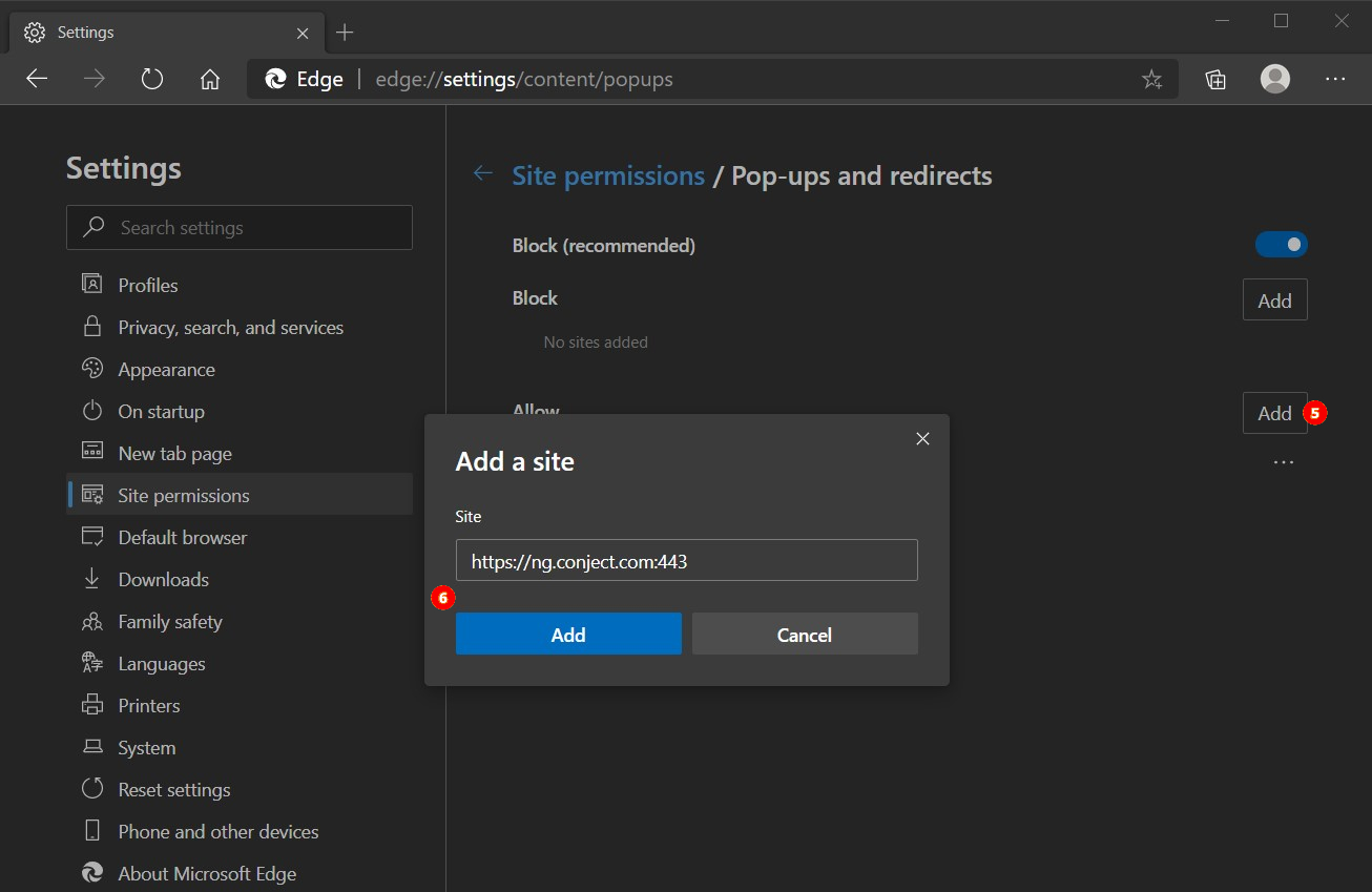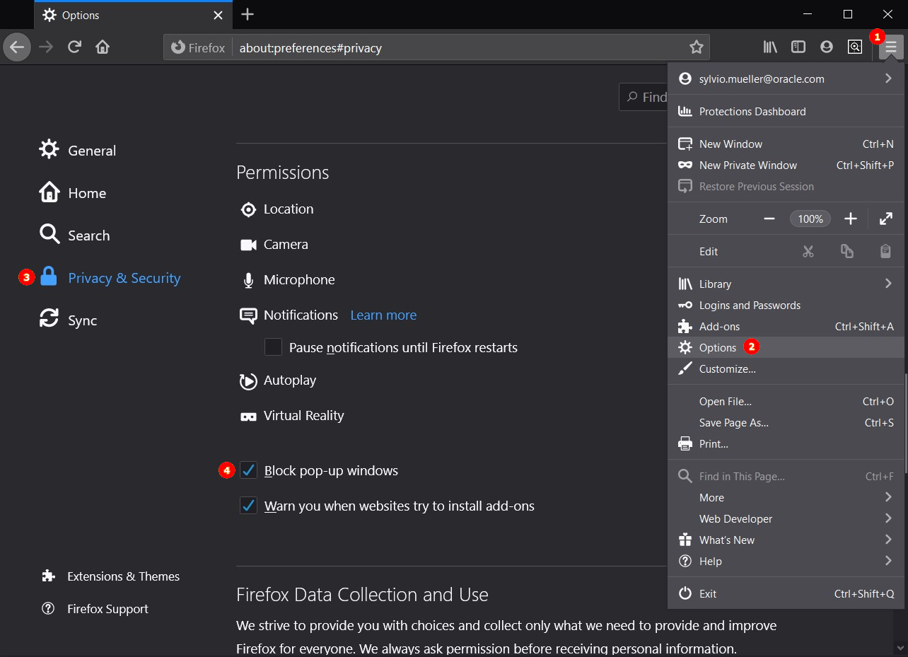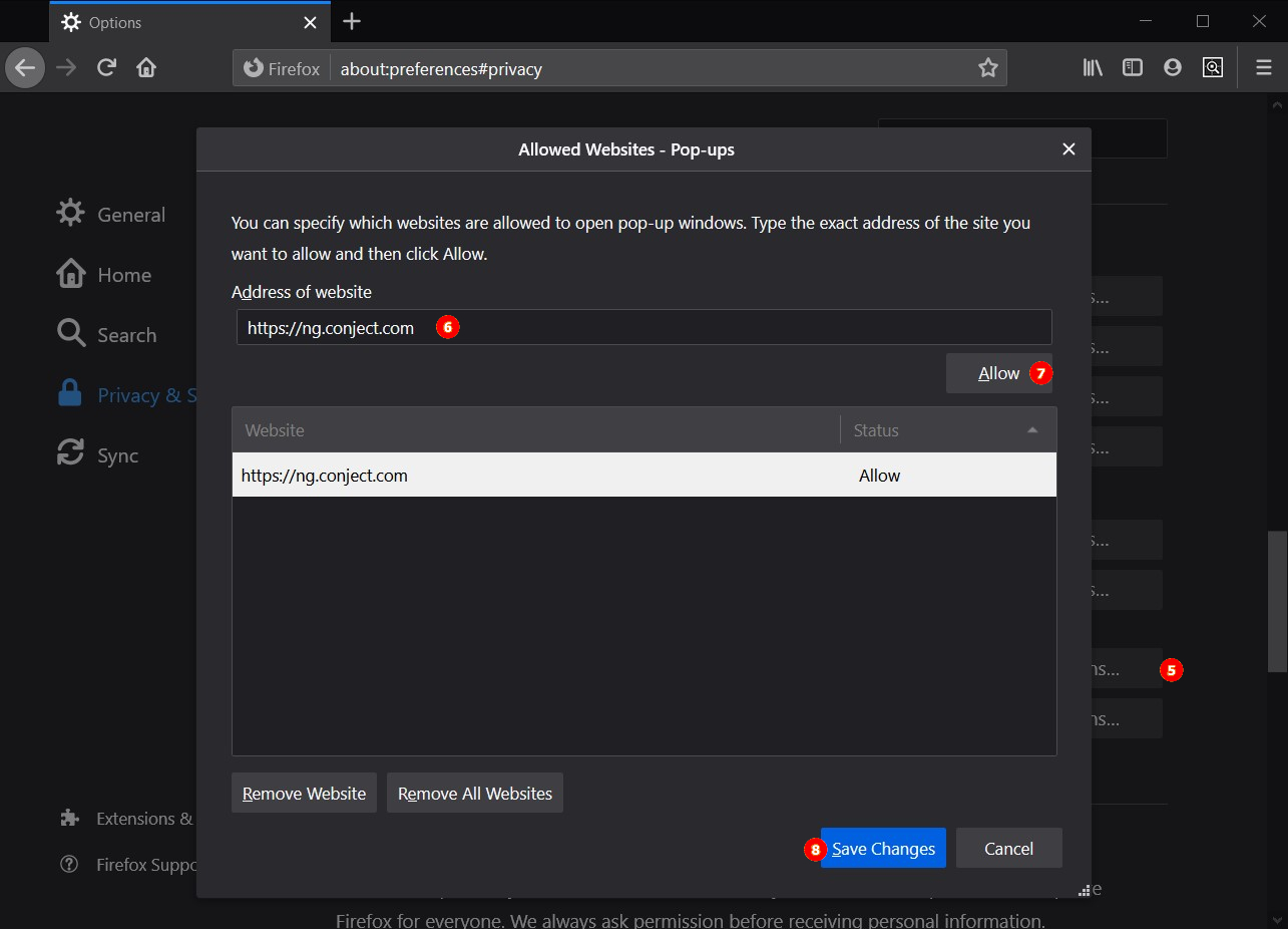 In order to work with ORACLE conjectPM, pop-up windows on the website must be allowed. By default, many browsers block pop-up windows. Of course you can also work with ORACLE conjectPM without deactivating your pop-up blocker. Normally your browser will inform you the first time you use conject that a pop-up window has been blocked. In this message you have the option to allow windows for this website. If you do not see the message, or can't find it, this article will help you set up your browser.