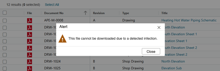 If Aconex detects that a file in your project is corrupt or infected, it will isolate it to prevent it from being downloaded or shared. Isolated files cannot be retrieved. For example, if you try to download an infected file, you'll see a message that the file is infected and cannot be downloaded. If you zip download multiple files, any infected files detected in the zip will be replaced with a text file to advise it cannot be downloaded.