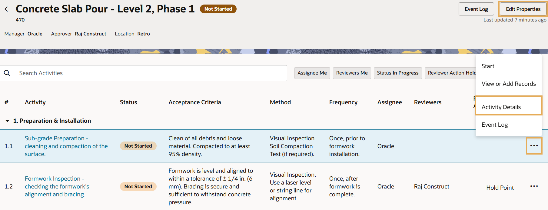 To edit an activity click the three dots menu for the activity and select Activity Details. You cannot edit a completed activity or an activity that is in review (except to reassign the reviewer).