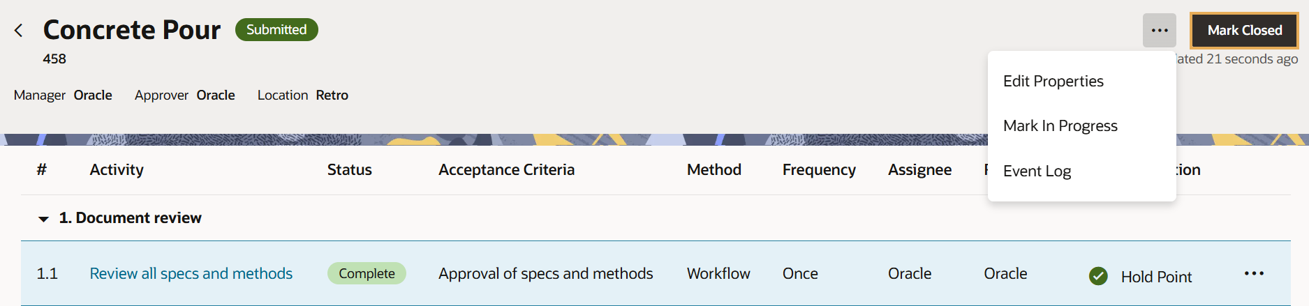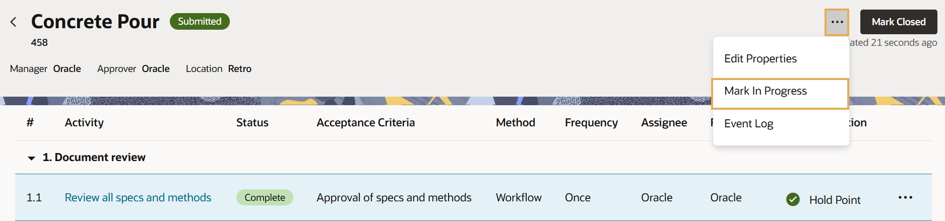 A Manager (or Approver) can submit a test plan once all activities are marked completed and all inspections within the activities are closed.