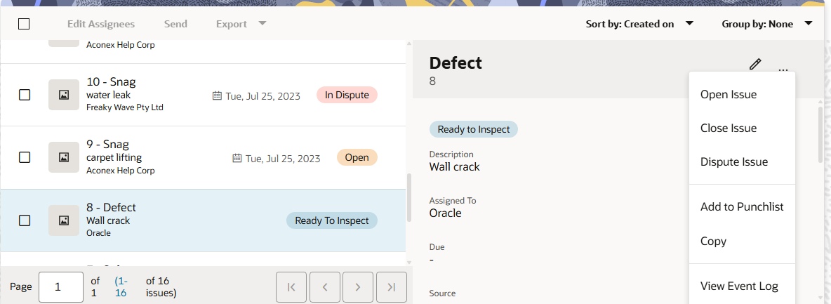 Use the filters to identify the issues that are Open, Ready to inspect or In dispute.