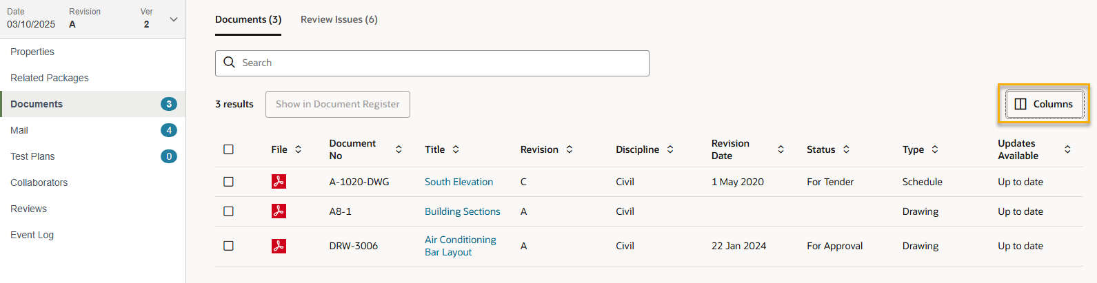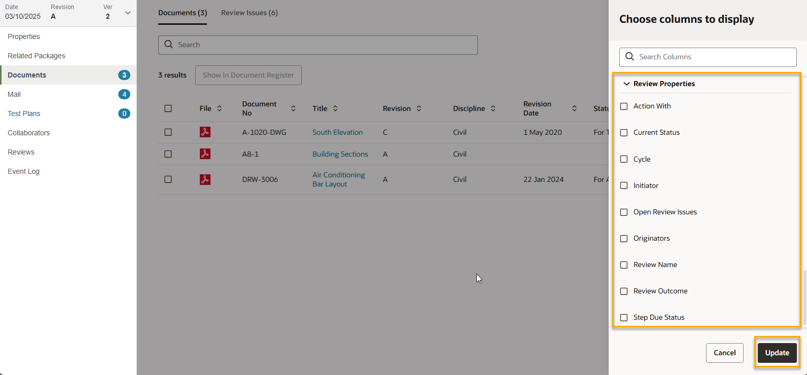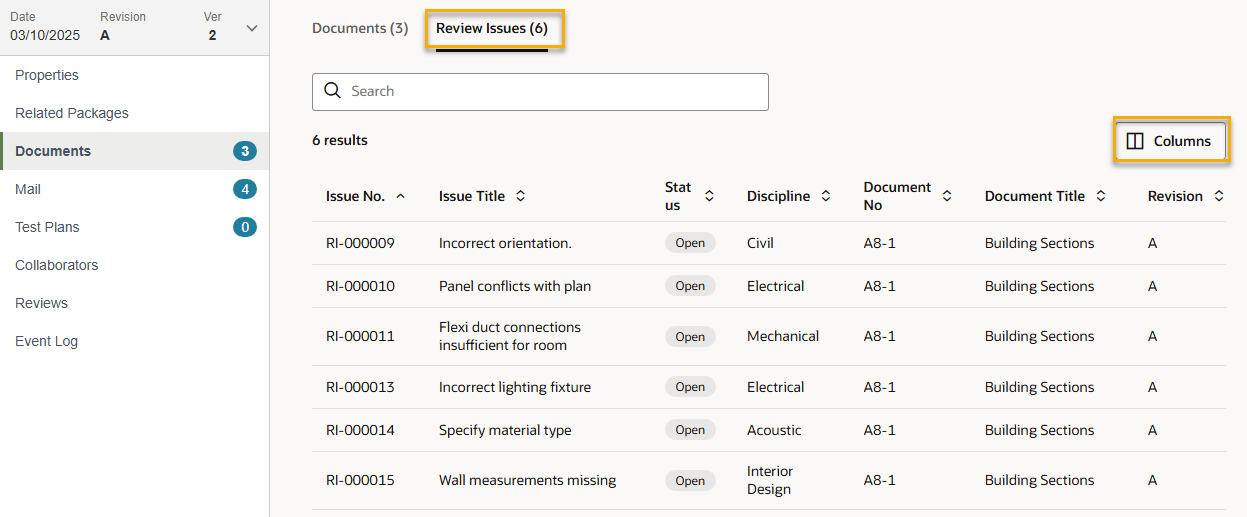 2. Click Columns and add the required fields from the document, review, and issue to get a consolidated view of the issue details.