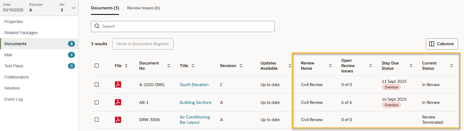 If you have documents in review in Document Processes, you can track their status from the package information. You can also see a list of review issues for all documents in the package. This helps you manage reviews of specific document versions within each of your packages.