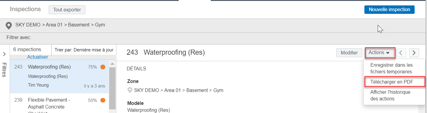 Cliquez sur le bouton Actions en haut à droit du panneau de l’inspection et sélectionnez Télécharger en PDF.