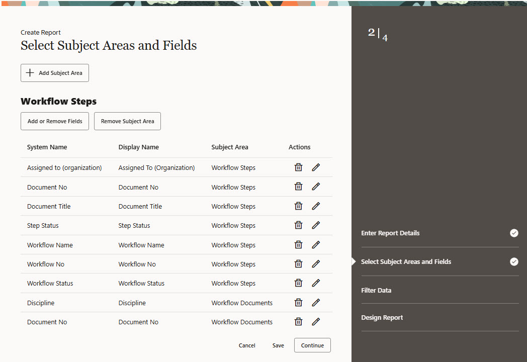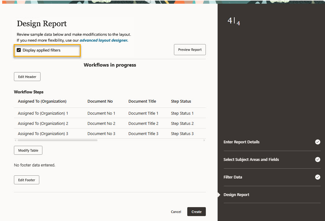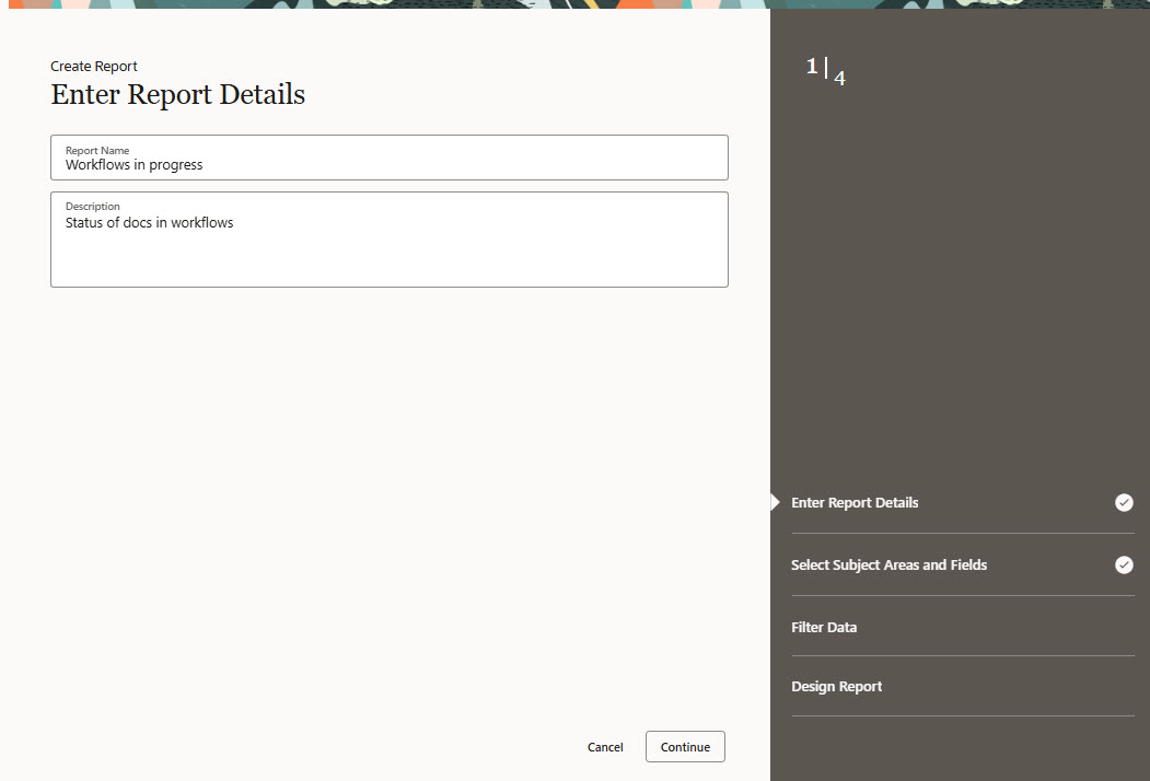 Créer un rapport en quatre étapes :Au fur et à mesure que vous franchissez chaque étape, vous verrez votre progression s'afficher sur la droite. À tout moment pendant le processus de création du rapport, vous pouvez cliquer sur les liens pour revenir à une étape précédente.