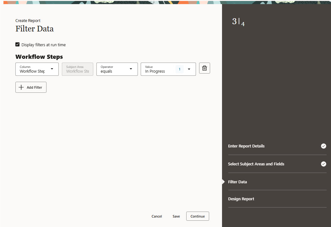 Sélectionner Display filters at run time (Afficher les filtres lors de l'exécution) pour permettre la modification des valeurs des filtres lors de l'exécution du rapport.