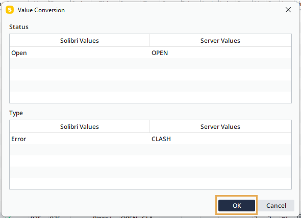 Before syncing an issue, Solibri may prompt you to convert field values to Aconex values (server values). Review and adjust these conversions as necessary, then click OK to continue.