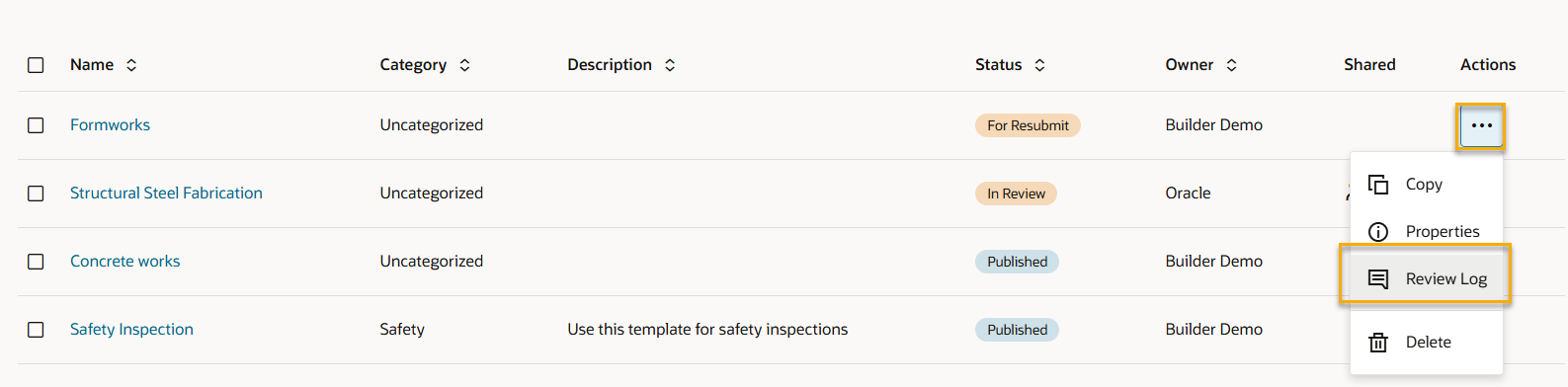 3. Click the three dots menu for the template you want to see review comments for and select Review Log.