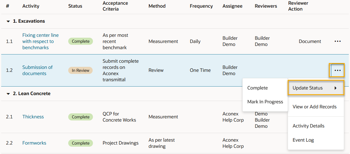2. Click the three dots menu for the activity and select Update Status.