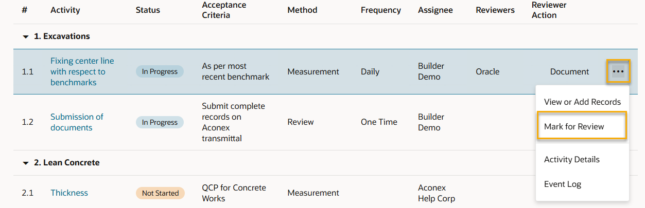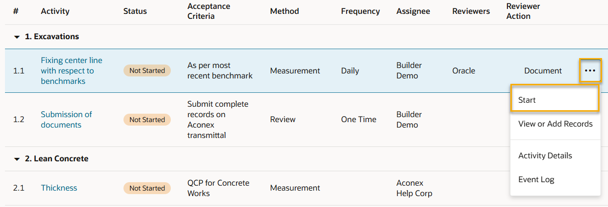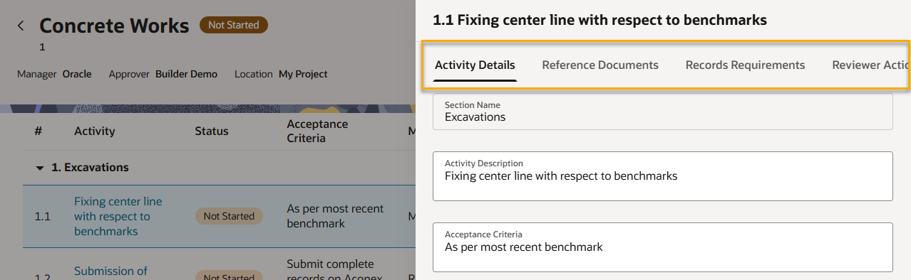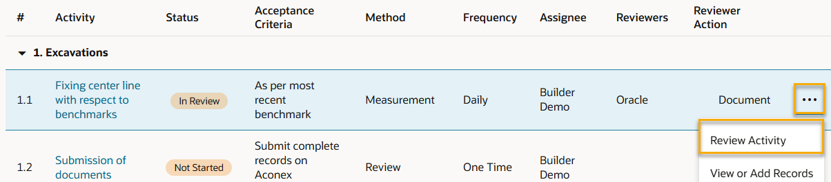 1. Click an activity to view the details of the task that you need to perform such as the description, acceptance criteria, method, and frequency.