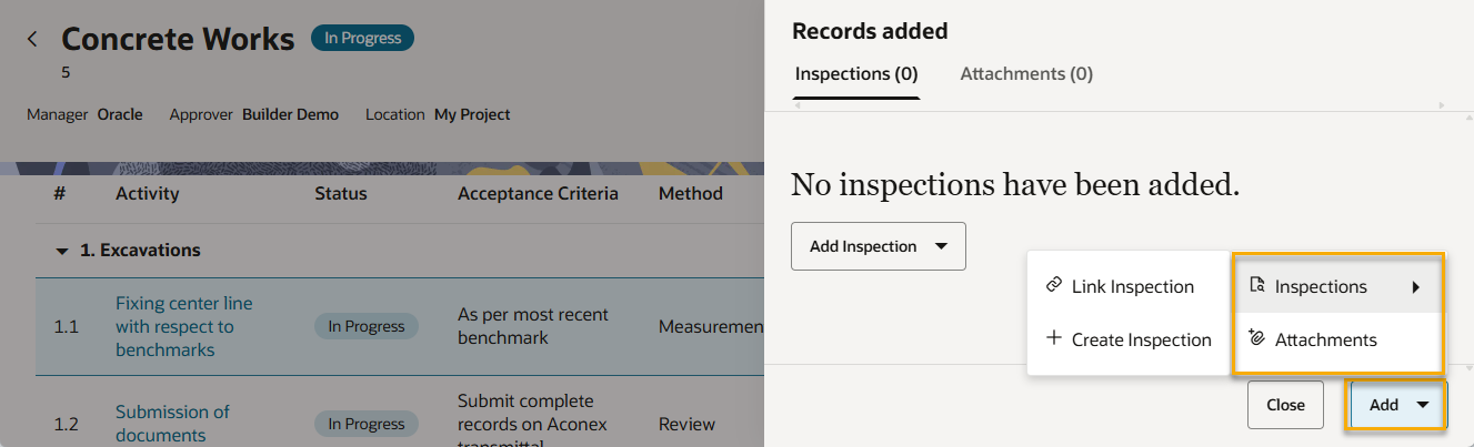 Add inspections and documents as evidence of the work you've done in an activity.