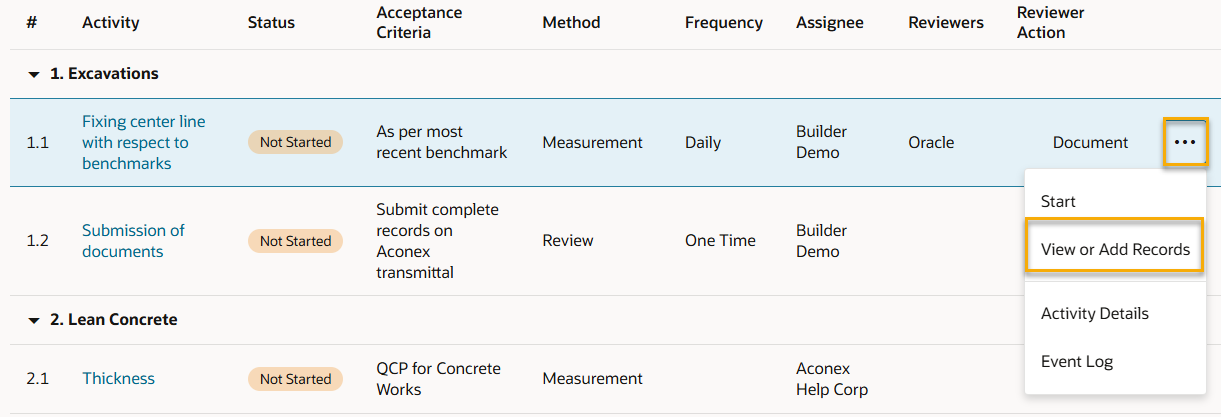 1. To add an inspection, click the three dots menu for the activity and select View or Add Records.