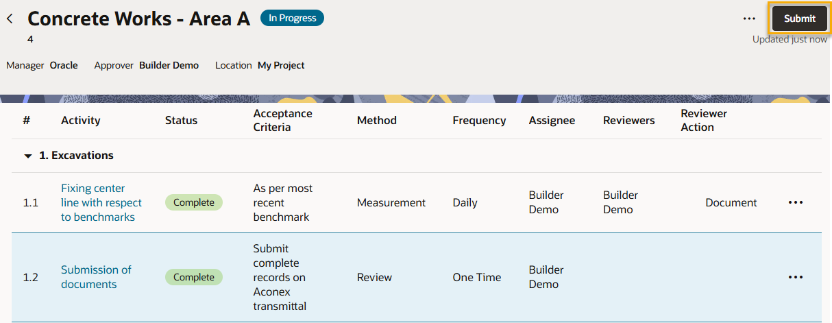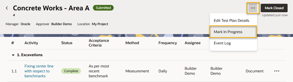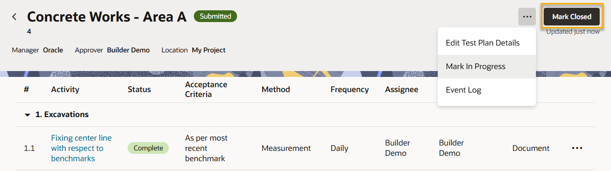 A Manager (or Approver) can submit a test plan once all activities are marked completed and all inspections within the activities are closed.