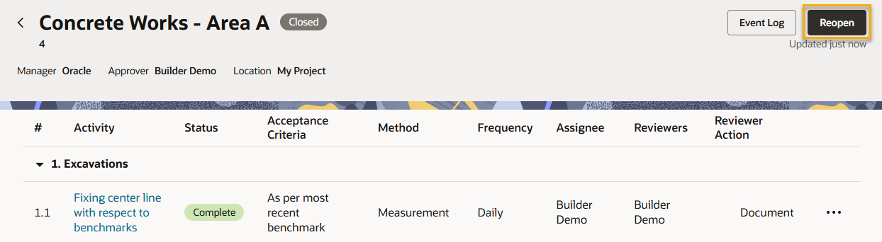 2. The Manager can reopen the activity where additional work needs to be performed.