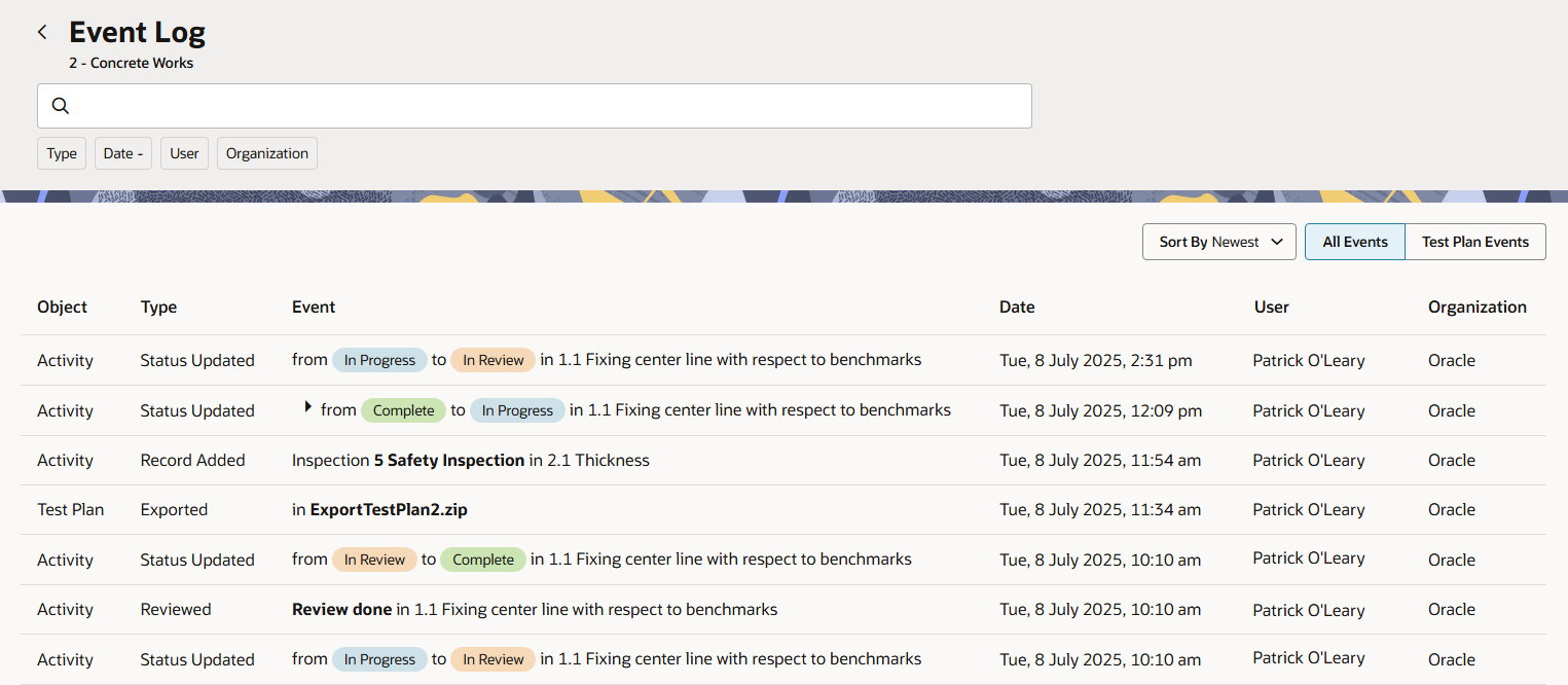 1. By default, the newest event log entry is displayed on top. You can sort by the oldest entry first and filter by test plan or activity events only.