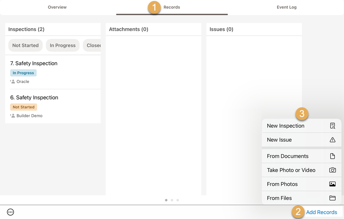 1. To add an inspection, tap the Records tab of the activity and tap Add Records.