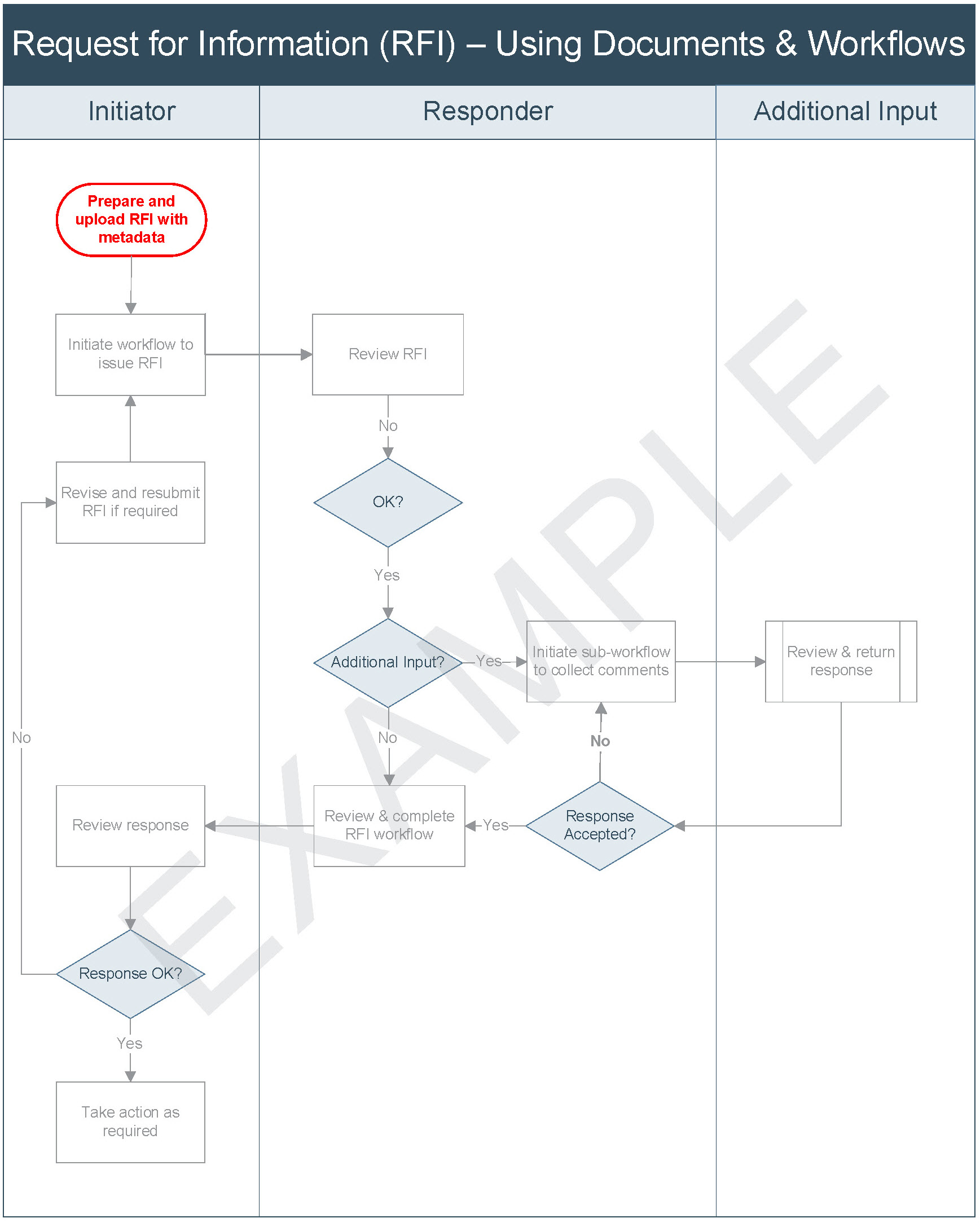 Aconex is routinely used for the management of Requests for Information (RFI) across many industries and projects and the diagram below depicts the basic steps typically seen in an RFI process.