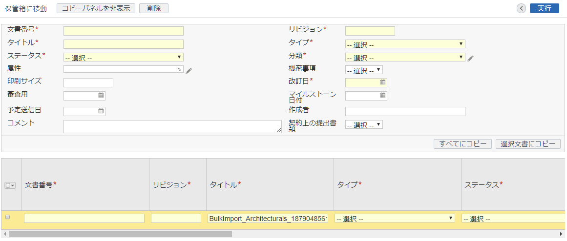 リストにある一部の文書にのみデータを適用するには、適切なデータを入力して、入力したデータを入力したい文書の文書番号の左横にあるチェックボックスを選択して、選択文書にコピーボタンをくりっくします。