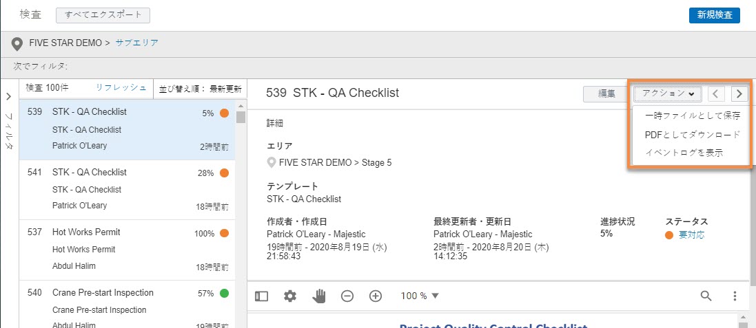 ブラウザからAconexにログインして、モジュールメニューのフィールドをクリックして、表示欄の検査を選択します。