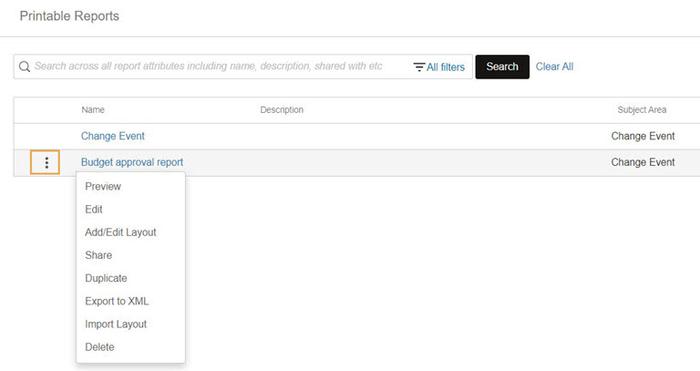 You may not see all options on every report. They are based on the report type and your access permissions. Predefined reports can only be previewed or duplicated.