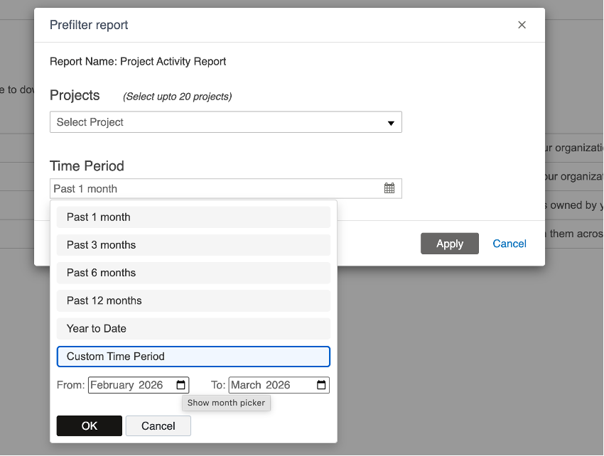 • The Project Activity Report now lets you set a custom date range of up to 24 months.