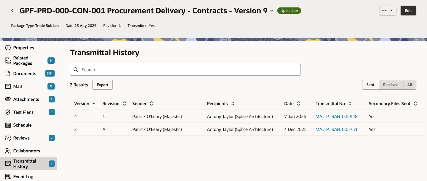• Package transmittal history now includes received transmittals, so you can filter between sent, received or all transmittals.