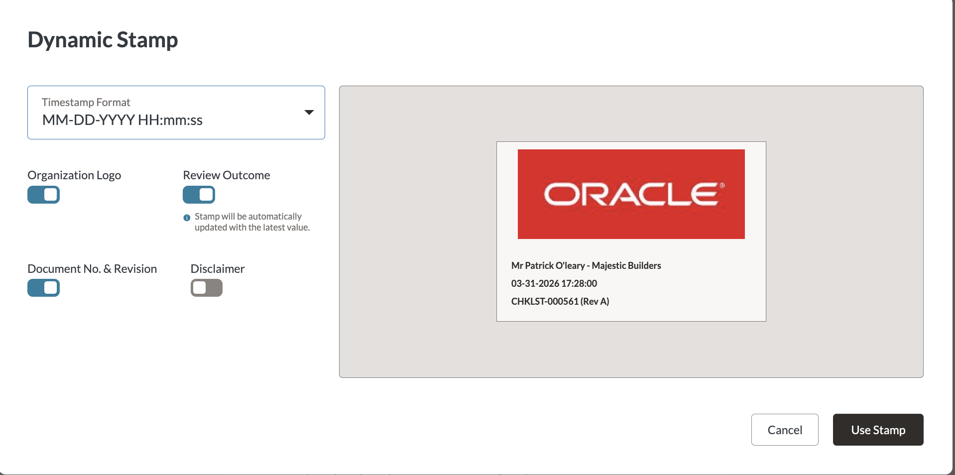 • You decide if you want to include the logo, review outcome, document number with revision, and the disclaimer.