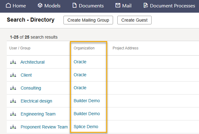 A shared mailing group can be used when sending a mail, updating a package distribution list, creating a workflow template, or sending a supplier document package. Mailing groups are shared as read only, which means only the creating organization can edit them to add or remove users.