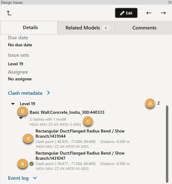 - Clash in the Cloud: Issues created from Clash in the Cloud will show detailed information under the Clash metadata heading. Use the image below to match detailed information in the Clash metadata section: