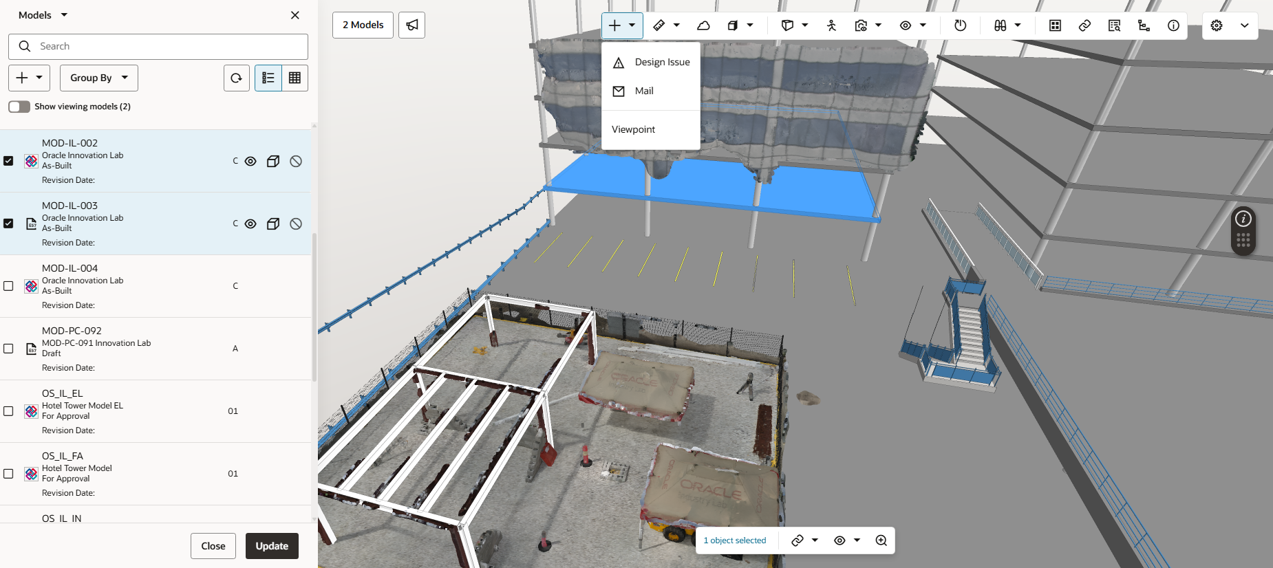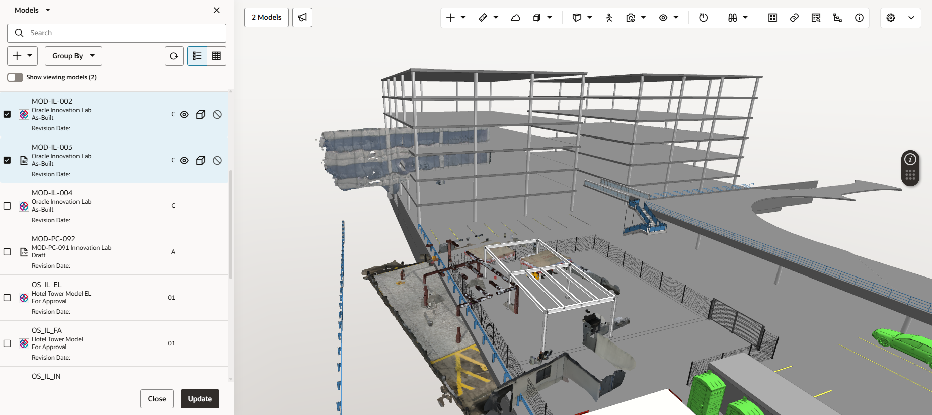 Aconex Models helps you to visualise actual site conditions from point cloud files and compare them with the 3D model. This is helpful during a design validation process to ensure the architect's intent aligns to what is being built on site. Additionally, the alignment tool positions the point cloud data with the model, helping you to identify defects or clashes early.