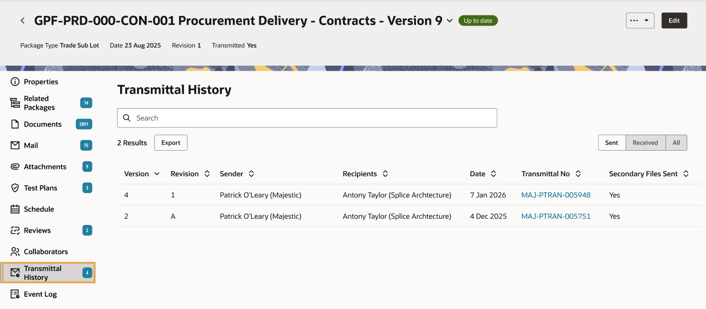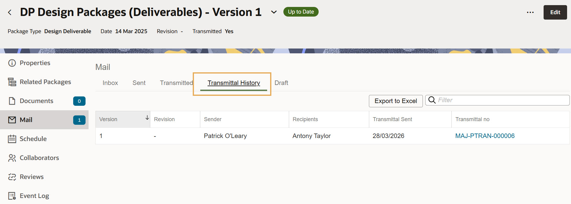 The Package Transmittal History for a single package can be exported by clicking Export to Excel when viewing the Transmittal History.