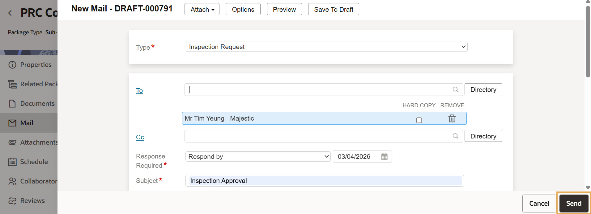 If you do not see a Mail option, you’ll need your Project Administrator to allow mail to be created from the package type