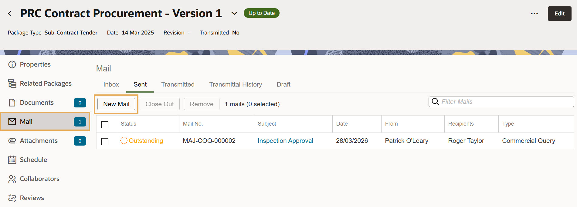 Click Mail in the left-hand column. You’ll see an area for Mail – any mail created from the package will be displayed here. You also have the following tabs: Inbox, Sent, Transmitted, Transmittal History, and Draft.