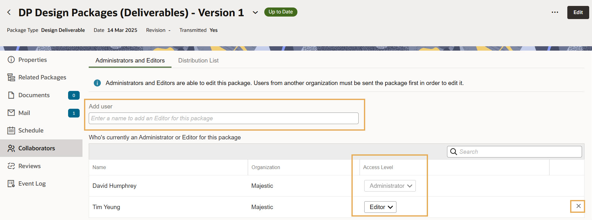 For permission to edit the access level, the same rules you’d have to edit collaborators within a package would apply. This means that if you are an Editor on one of the packages selected, you won’t be able to add Administrators or to upgrade an existing Editor to Administrator. If you don't have permission to edit the collaborators on all of the selected packages, you’ll see a message telling you.