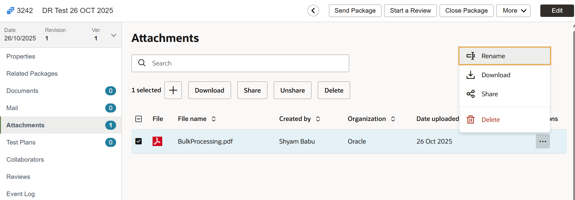 You can rename files directly in the Attachments area in Packages instead of having to download the file, rename it on your local folder and re-upload it to Aconex.