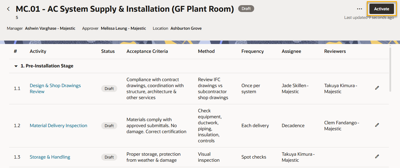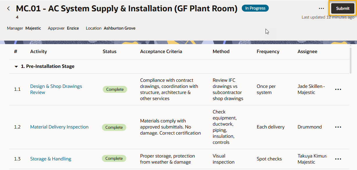 In this example, the main contractor for a multi-story apartment needs to ensure all air conditioning systems are installed to a high-quality standard. They need to track progress of the installation, review the work completed at important milestones, and capture all evidence of the installation to handover to the client. The test plan template has already been published with the appropriate organizations set as the Assignee(s), Reviewer(s), Manager, and Approver.