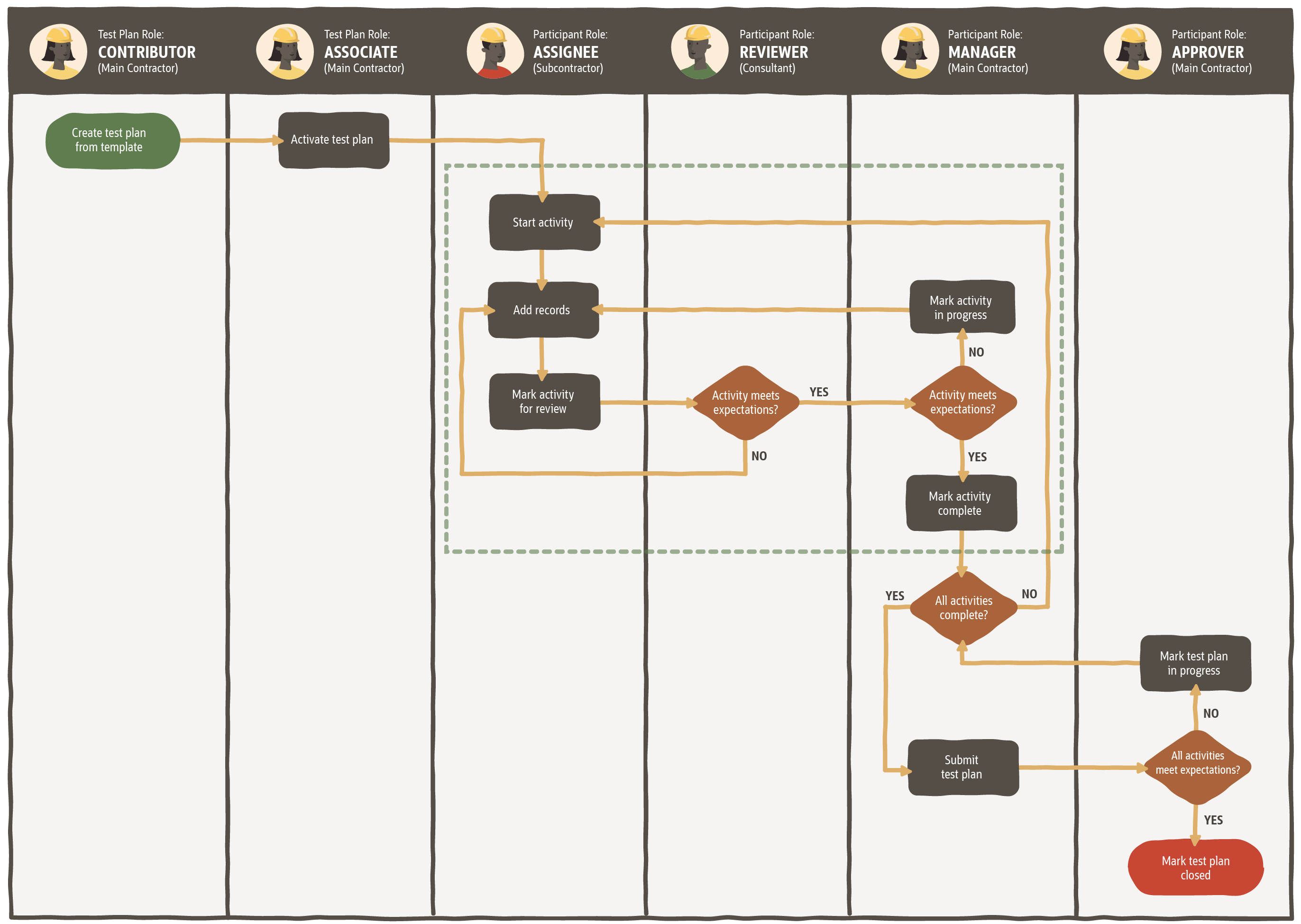 The main contractor creates and activates the test plan, marks activities as complete, and closes the test plan. The subcontractor works on their activities, and the consultant verifies their work.