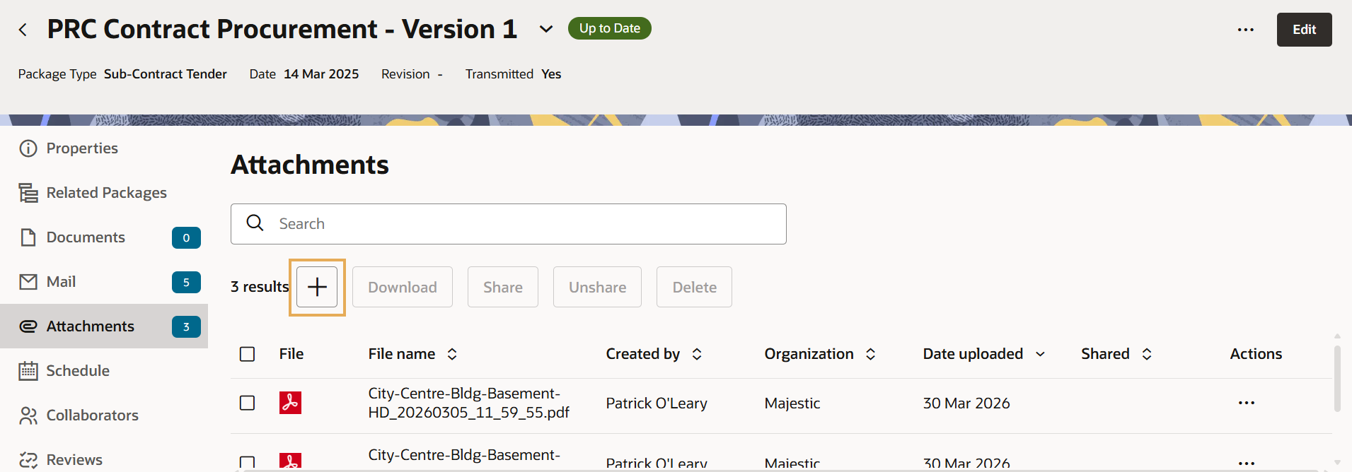 The Attachments functionality allows you to easily drag and drop non-controlled files, such as delivery dockets or site photographs, to your package, without having to register them through the Document Register. You can also download, share, unshare and delete files either singularly or in bulk.