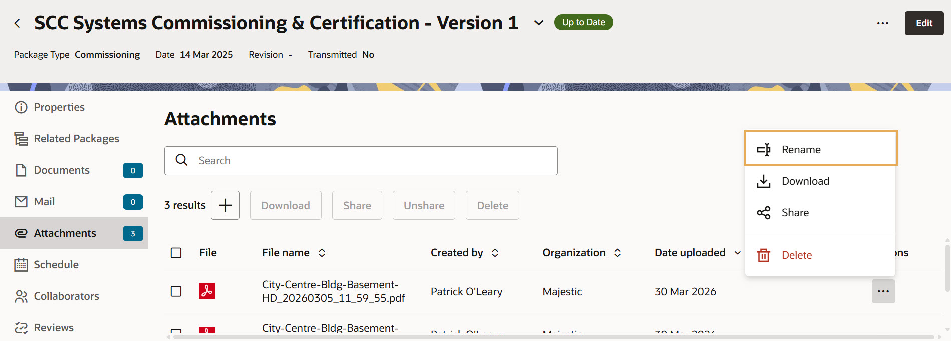 You can rename files directly in the Attachments area in Packages instead of having to download the file, rename it on your local folder and re-upload it to Aconex.